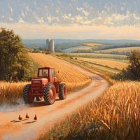 Een rode tractor snijdt door goudkleurig graan, terwijl glooiende heuvels zich uitstrekken tot aan de horizon. De lucht, bezaaid met fijne wolken, weerspiegelt de vredige sfeer van het plattelandsleven. Drie kleine vogels waggelen nieuwsgierig langs de kant van de weg en voegen een levendig accent toe aan het harmonieuze landelijke landschap.