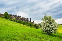 Landschaft mit Bäumen und Felsen im Harz van Rico Ködder
