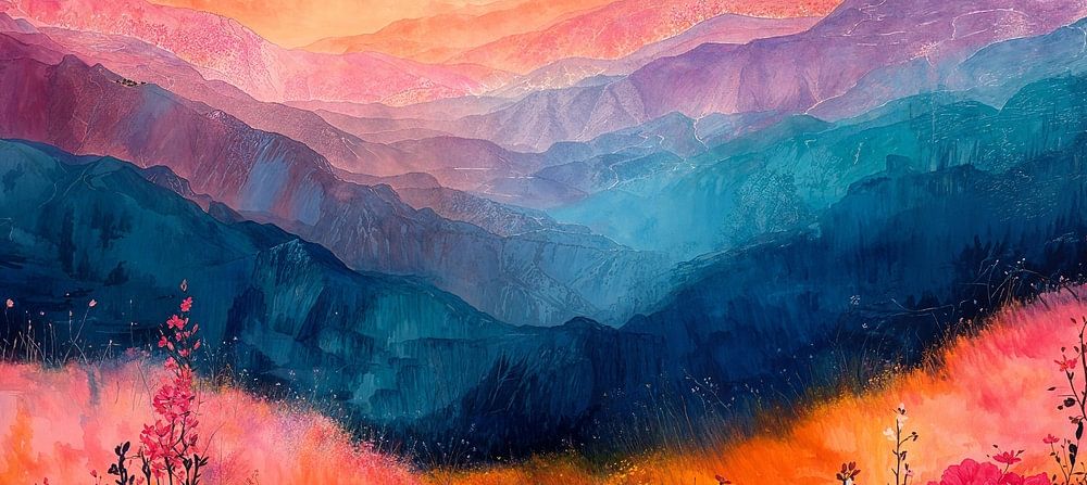 Details: bloemen, bergen, zonsondergang, abstract, kleurrijk, roze, blauw, rood, landschap, modern