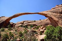 Het best mogelijke uitzicht bereikt op Landscape Arch, onderdeel van de Devil's Garden in Arches National Park, Utah, VS. Het ziet eruit alsof er niet veel voor nodig is om af te brokkelen. Ik ben erg blij dat ik de lange wandeling naar dit punt heb gemaakt.