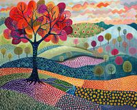 Landschap | DreamScape - Dit kleurrijke landschap schilderij toont een levendige scène met een centraal geplaatste boom met veelkleurige bladeren tegen een achtergrond van golvende, gestileerde heuvels en een scala aan decoratieve bomen.