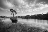 Een zwart wit foto gemaakt aan een ven.