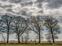 Landschap in het Friese natuurgebied Gaasterland met bomenrij en een windmolen met de IJsselmeerdijk als horizonlijn nabij Nijemirdum