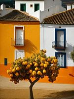 Het idyllische tafereel toont een zonnig geel huis met groene luiken, waarvoor een weelderige sinaasappelboom staat met rijpe, oranjekleurige vruchten. Het huis heeft een bruin pannendak en een kleine schoorsteen. Een ander wit deel van het huis is ook zichtbaar, evenals een groen raam en een groene deur. In de tuin groeien nog meer groene struiken en een kleine olijfboom. Op de achtergrond torenen slanke cipressen de heldere lucht in. Het kleurenpalet is warm en levendig en creëert een vredige en mediterrane sfeer.