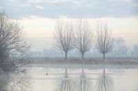 Landschap, foto, horizontaal van 3 wilgenbomen in maart aan de waterplas. ‘S ochtends heel vroeg genomen . Er is nog wat nevel te zien op het water.
