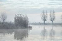 Horizontale foto van een waterplas in de vroege ochtend met een restje nevel riet wilgen en weerspiegelend water op een mooie lichte koude ochtend.