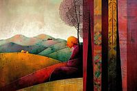 Details: heuvels, boom, figuur, geometrisch, tekst, patroon, abstract, landschap, kleurrijk, kunst