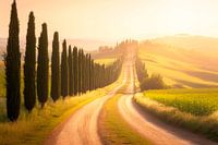 In zacht, gouden ochtendlicht baant een schilderachtige weg zich een weg door eindeloze groene heuvels, omringd door prachtige cipressen die als schildwachten fungeren. De harmonieuze combinatie van natuur en verlichting creëert een sfeer van tijdloze rust en nodigt je uit om het pad te verkennen en tot rust te komen.