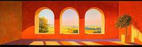 Landschap Uitzicht | Bogen en Boom - In dit landschap schilderij zie je een uitzicht door drie bogen met een helder landschap vol velden en een boom aan de linkerkant, alles opgenomen in warme oranje tinten.