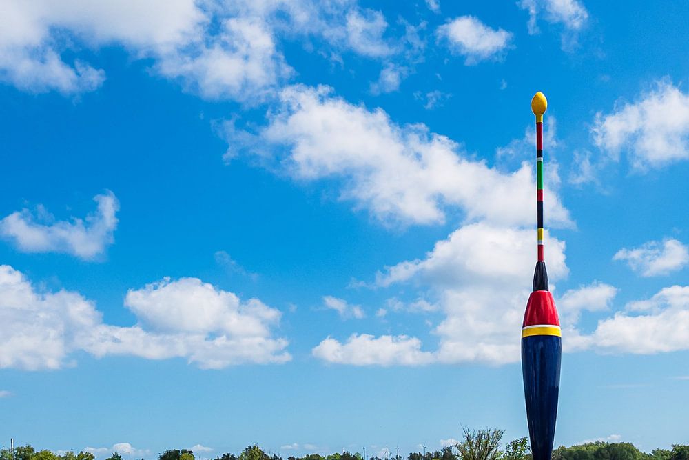 Landschap aan de rivier Warnow met reusachtige pose in de hanzestad Rostock.
