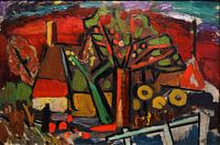 Landschapsschilderij van Bennekom, bij Ede in Gelderland. We zien een boerderij met bomen en een hekwerk in dit expressionistisch schilderij.