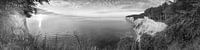 XXL-panorama van de krijtkust en de krijtrotsen op het eiland Rügen in Mecklenburg-Vorpommern. s Morgens bij zonsopgang boven de Oostzee schitteren de krijtrotsen in het Nationaal Park Jasmund bijzonder mooi in het zonlicht.