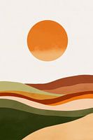 Zachte golven in warme aarde- en groentinten vormen een harmonieus landschap, terwijl een stralende, oranjekleurige zon majestueus aan de hemel zweeft. Het zachte kleurenpalet straalt een gevoel van rust en warmte uit, alsof de natuur het licht en de schaduwen van de dag in perfecte balans omarmt. Een uitnodigend beeld dat doet dromen…