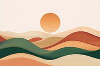 Een harmonieus landschap ontvouwt zich in zachte golfvormen, waar aardetinten vloeien in warm rood en zacht groen. Een grote, gouden bol van de zon rijst majestueus op aan de horizon en verleent het scenario een kalme, uitnodigende sfeer. Natuur en kunst smelten hier samen tot een vredig totaalbeeld dat uitnodigt om te dromen.