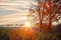 Een sfeervolle foto van een (Nederlands) Limburgs landschap bij zonsopkomst. Om de eerste zonnestralen over het land niet te missen al vroeg ter plekke en zo een warme goed met een beetje mist te kunnen vastleggen op een zeer koude morgen. Het bevroren mosterdzaad op de voorgrond geeft een mooie warme gele kleur.