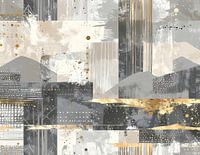Een abstracte compositie overgoten met beelden van landschappen en patronen van lijnen en stippen in grijs- en goudtinten, die het geheel een mysterieuze, ondefinieerbare kwaliteit geven, op de grens van het echte en het onwerkelijke, bevorderlijk voor de verbeelding's zwerftochten. Delicaat gesuggereerde bergen voegen een vleugje…