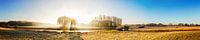 Prachtig panorama van een herfstlandschap bij zonsopgang met rivier, bos en paarden op een weiland