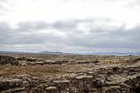 Dit uitzicht is te zien in de buurt van de dead man walk in het Þingvellir nationaal park. Het uitzicht is heel breed en overal waar je kijkt is een klein beetje vegetatie tussen de rotsen.