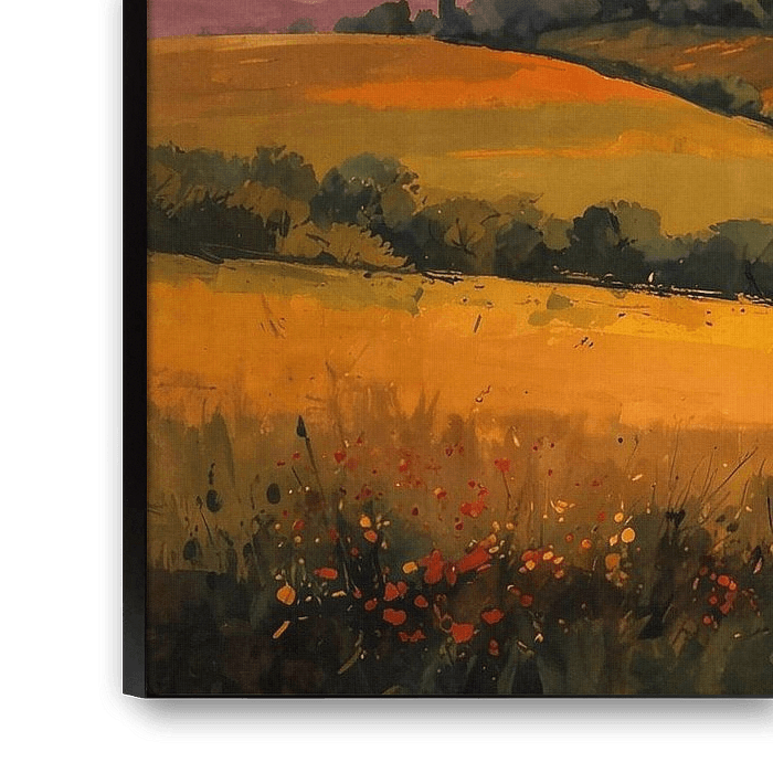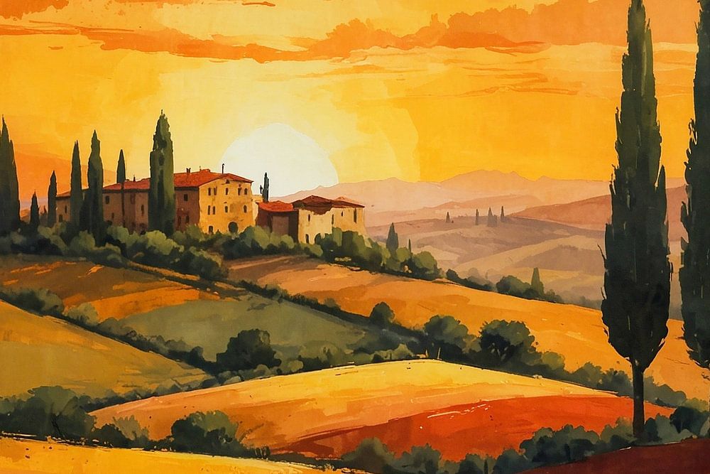 Dit is een digitaal kunstwerk van een landschap in Toscane bij zonsondergang. Een zomers beeld met cipressen en een traditioneel huis. Het schilderij geeft je direct een vakantiegevoel. Een vrolijk en kleurrijk schilderij geschikt voor elke ruimte.