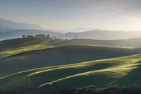 Landschap in Toscane met boerderij en glooiende heuvels op een wintermiddag. Een typisch uitzicht op de Val d'Orcia.