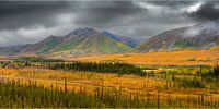 De foto toont een landschap met bergen en taiga in de Brooks Range in Alaska. Het is herfst en de vegetatie is geel bruin gekleurd. Boven de bergen hangt een dreigende lucht. De foto is in panorama formaat