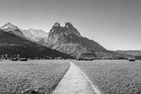 Landschap in zwart-wit. Wettersteingebergte met prachtige weiden en kleine houten hutjes op de alp bij Garmisch Patenkirchen en Grainau.