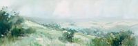 Een glooiende heuvel strekt zich in de verte uit, gehuld in een delicate mist. De zachte kleuren en fijne penseelstreken geven het landschap een dromerige kwaliteit. Geïsoleerde bomen staan stil en getuigen van de rust die dit idyllische tafereel omringt. Hemel en aarde smelten hier samen in een harmonieus geheel.