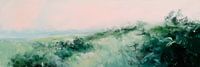 Een zachte overgang van zachte, groene heuvels naar een delicate, pastelkleurige luchtspanne. De levendige penseelstreken creëren een gevoel van beweging, alsof de natuur even pauzeert om rustig adem te halen. Naast het rustige landschap fluisteren de kleuren verhalen van vrede en ongerepte schoonheid.