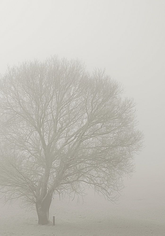 Boom aan de oever van de Elbe bij Maagdenburg in Duitsland op een herfstdag in de mist