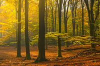 Landschap met Beukenbomen met gouden bladeren in een bos tijdens een mooie herfstdag in het natuurgebied de Veluwe in Gelderland.