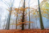 Landschap in een mistig beukenbos tijdens een prachtige herfstdag in het Veluwse natuurgebied in Gelderland.
