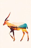 Een harmonieus samenspel van natuur en dier ontvouwt zich in kleurrijke landschappen die spelen rond het lichaam van een majestueuze antilope koe. De zachte kleurovergangen en het gebogen silhouet geven elke kamer een levendig tintje. Ideaal voor de woonkamer om een ontspannen en inspirerende sfeer te creëren.