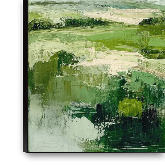 Zachte heuvels spreiden zich uit onder een zachtroze lucht, terwijl verschillende groentinten harmonieus met elkaar spelen. De vloeiende penseelstreken creëren een kalmerende sfeer die de kijker meeneemt naar een rustige, natuurlijke wereld. Het uitzicht wekt een verlangen op naar ongerepte natuur en rustige momenten in de buitenlucht.