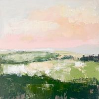 Zachte heuvels ontmoeten een delicate, pastelkleurige lucht die de eerste ochtendstralen vangt. De harmonieuze groentinten smelten samen met sponsachtige penseelstreken en geven het tafereel een dromerige lichtheid. Het rustgevende landschap straalt een tijdloze kalmte uit en nodigt je uit om te blijven hangen en te dromen.