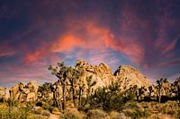 Landschap met Joshua Tree en rotsen bij zonsondergang en wolken in Joshua Tree National Park