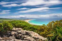 Een prachtige zomerdag met weids uitzicht op de turkooisblauwe zee en het witte strand van Tarifa in Andalusië/Spanje.