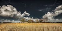 Land in het noorden van de provincie Friesland ter hoogte van Holwerd met een stevige wolkenlucht en riet op de voorgrond.