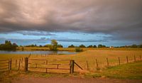 In de verte staan huizen als stille getuigen van het ritme van het platteland. Hier heerst geen haast, alleen ademhaling. De dreiging van een naderende bui maakt het licht des te kostbaarder—een gouden rand aan een grijze wolk.