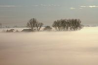 Ales een deken hangt deze mistlaag over het landschp zodat alleen een stuk van de daken en bomen van een boerderij nog zichtbaar zijn