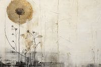 Landschap met gouden accenten in collage stijl. Bloemen in een landschap, mixed media. Kies zelf het formaat en materiaal bij deze blikvanger en maak het werk helemaal passend voor jouw interieur.