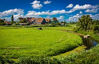 Landschap met huisjes op Marken, Nederland. De karakteristieke bouw van de houten huizen op het eiland Marken. Een bootje in de sloot. Een typisch Hollands plaatje. Digitale bewerkt tot schilderij. Verzadigde kleuren.