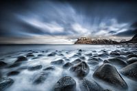 * rondgepolijste stenen door het zand, de zee en de golven op een natuurlijk strand op de Lofoten-eilanden in Noorwegen. Op de achtergrond ziet u een fjord met daarachter bergen en een prachtige lucht met wolken. 320143ays