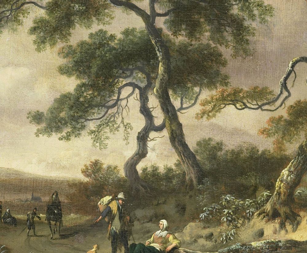 Landschap met marskramer en rustende vrouw, Jan Wijnants