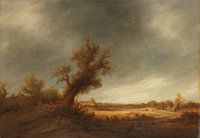 Duinachtig landschap met links de oude boom. Links zit een man langs de weg, rechts op de achtergrond gaat een herder met schapen over een weg met een stenen brug.