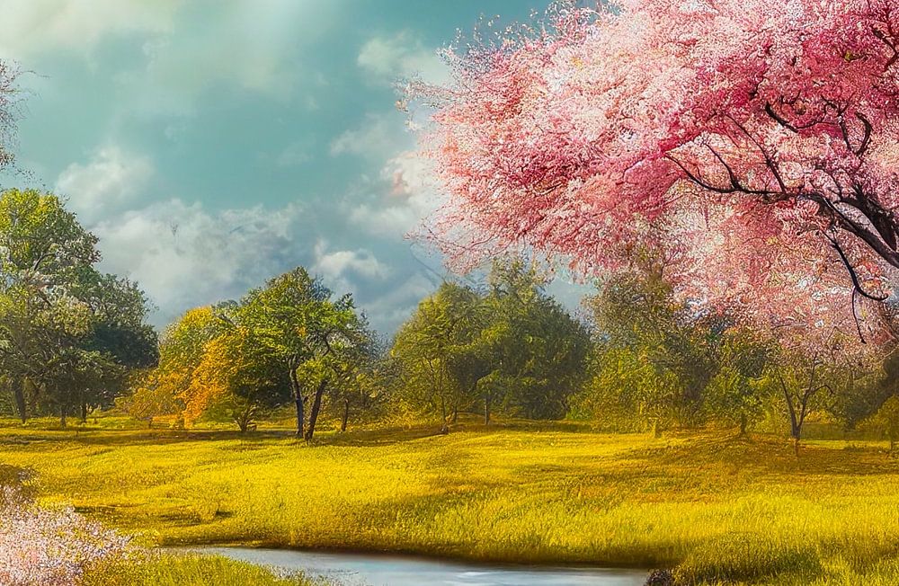 Landschap met rivier en bloeiende kersenbomen schilderij illustratie 02