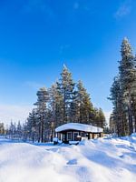 Landschap met sneeuw en houten hut in de winter in Kuusamo, Finland.