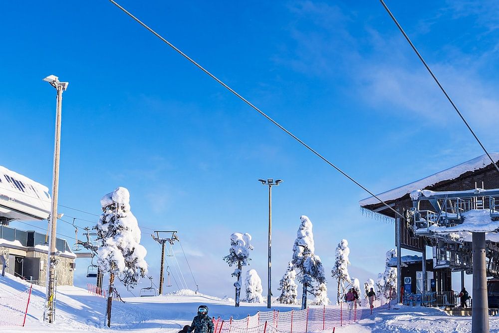 Landschap met sneeuw en kabelbaanstation in de winter in Ruka, Finland.
