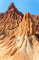 Landschap met steile bergen en sleuven voor blauwe lucht. Op vakantie in Portugal fotografeerde ik deze kale oranje bruine rotsen die nogal opvallen in de natuur. Het rotsachtige karakter maakt dat er vrijwel geen begroeiing aanwezig is.
