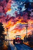 Een levendige kleurenpracht ontvouwt zich in de lucht terwijl een rode tractor rustig over de weg rijdt. De wolken gloeien in warme oranje en paarse tinten, terwijl de hoogspanningskabels zachtjes op de achtergrond blijven hangen. Het landschap straalt een vredige landelijke romantiek uit en nodigt je uit om de natuur in te vluchten.
