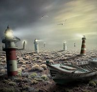 Landschap met vuurtorens. Een compositie van elf foto's. De foto's van de vuurtorens zijn afkomstig uit diverse Europese landen en de Canarische eilanden.